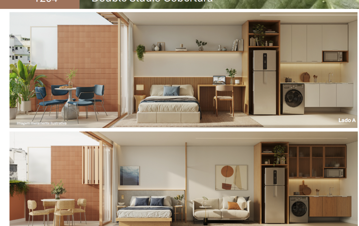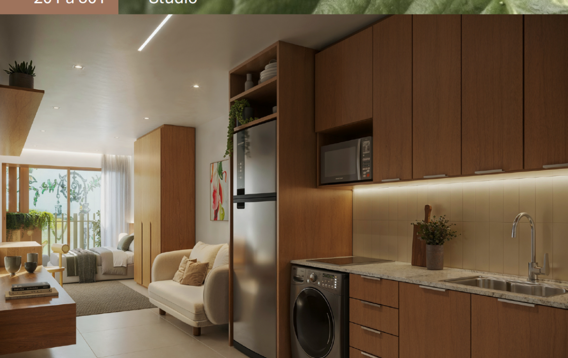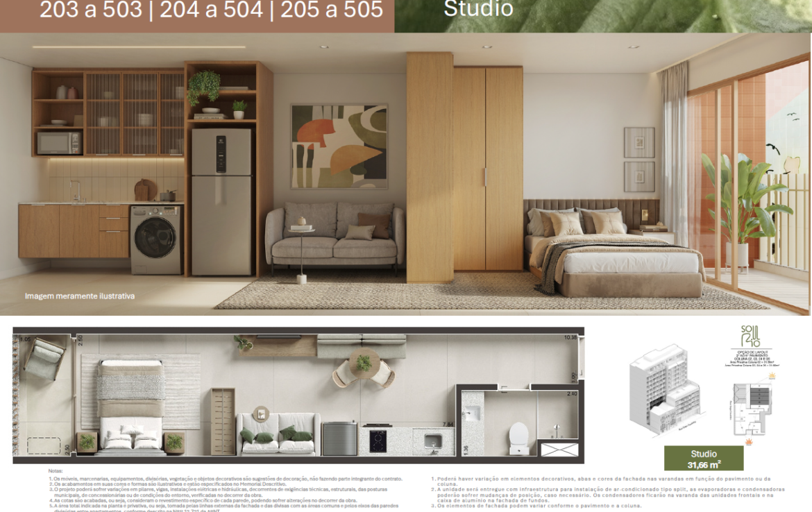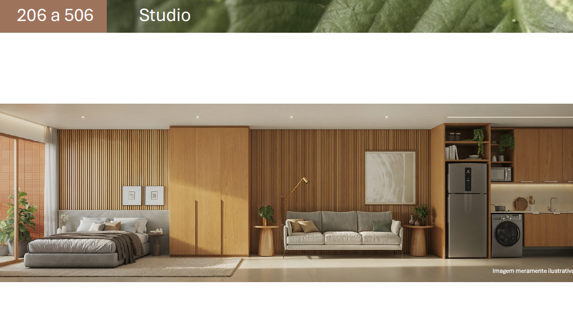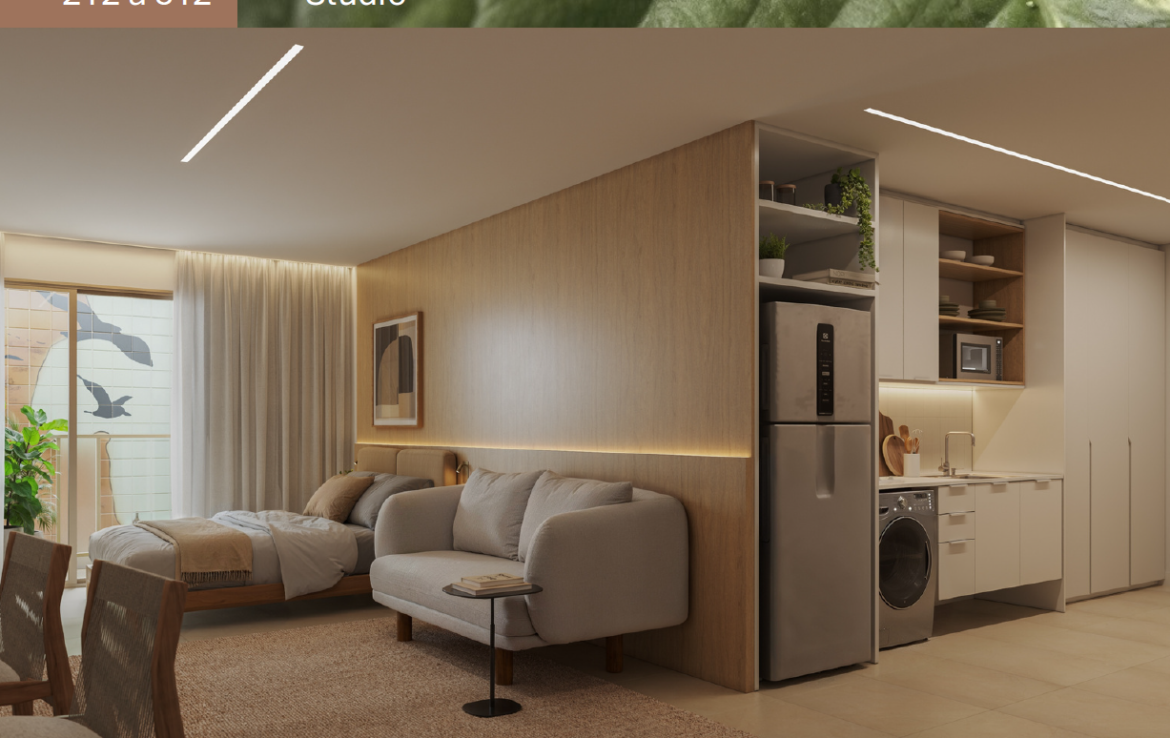 As plantas vão de 27,81 m² a 82,65 m², com studios com e sem varanda e opções gardens.
