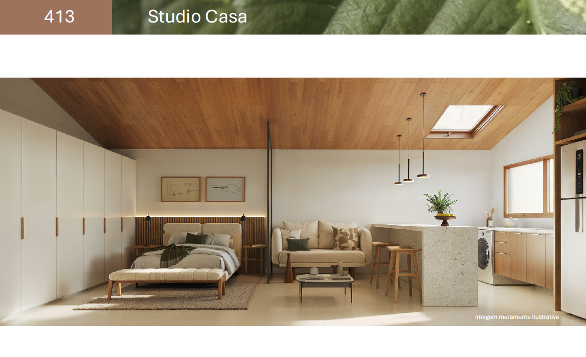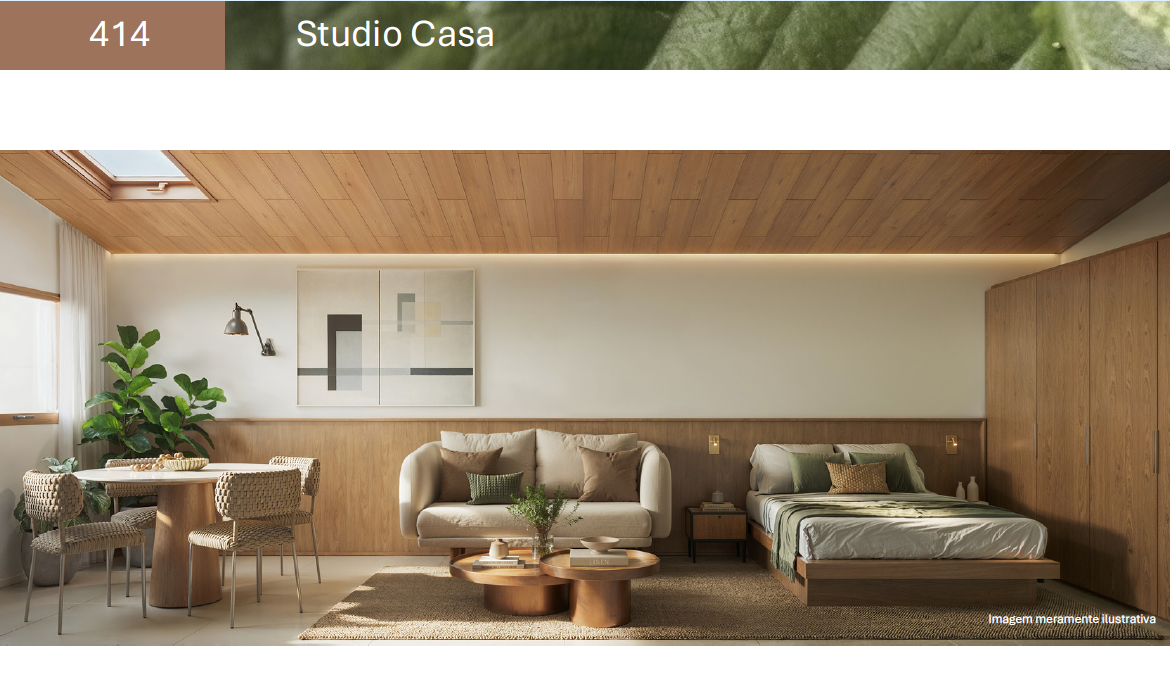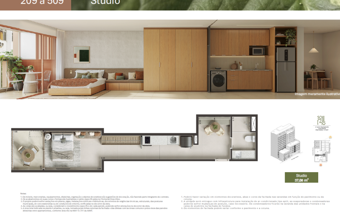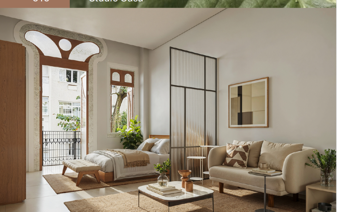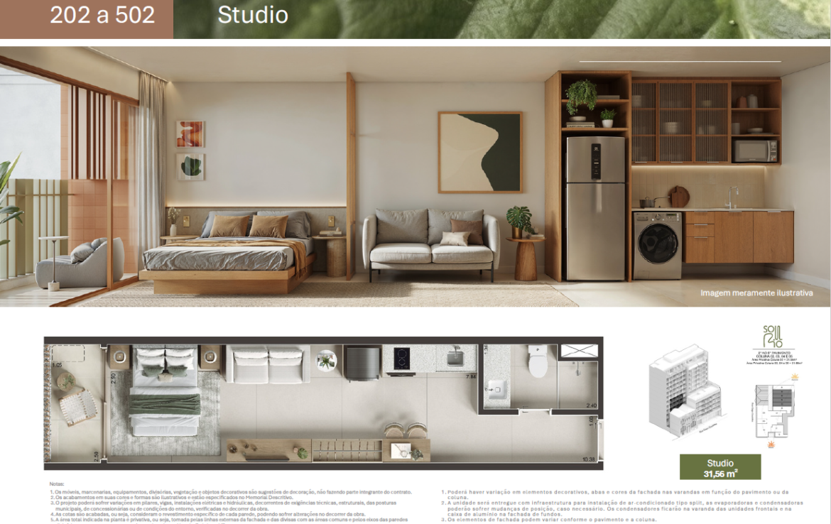 As plantas vão de 27,81 m² a 82,65 m², com studios com e sem varanda e opções gardens.